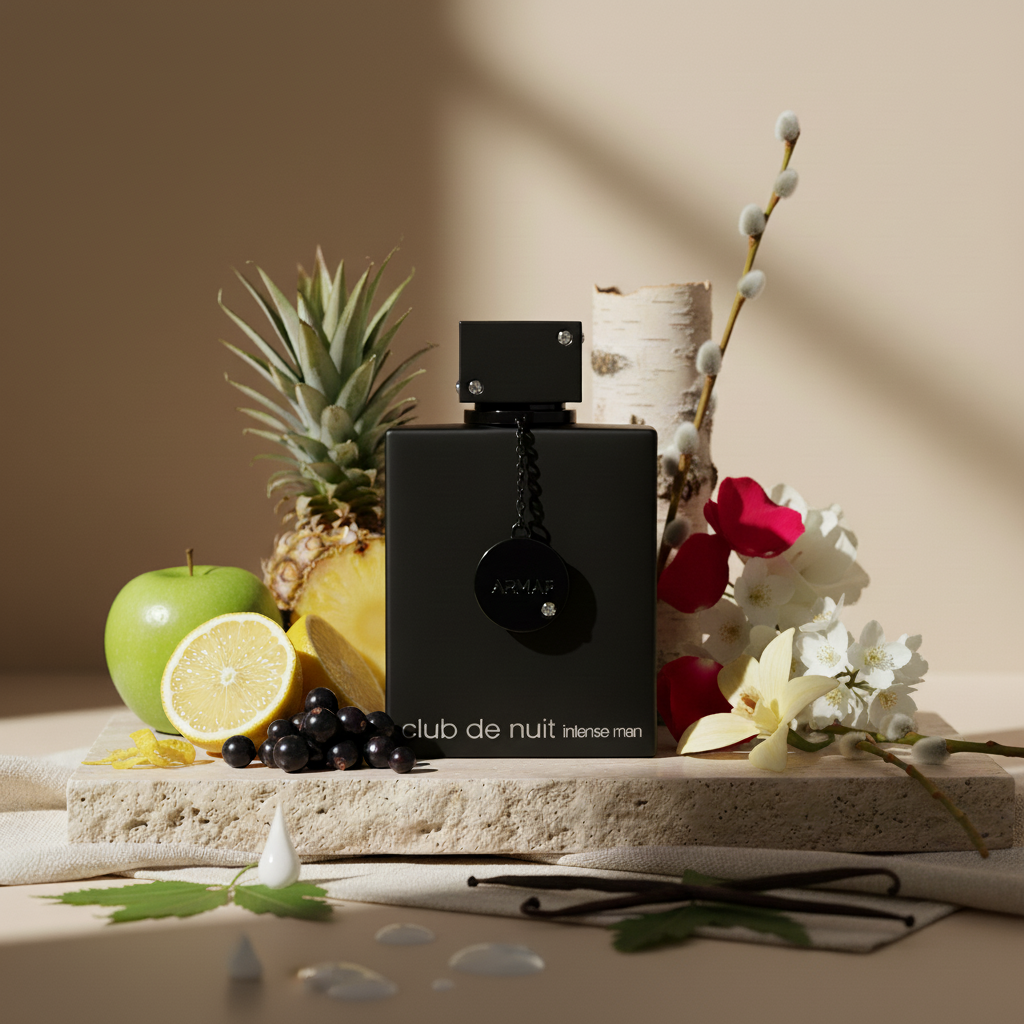 The fragrance opens with apple, bergamot, blackcurrant, pineapple, and lemon, followed by a heart of rose, birch, and jasmine that adds smoky depth. The base settles into musk, patchouli, and vanilla, leaving a rich and masculine trail.